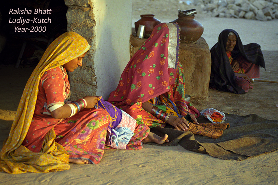 આવા અનેક પાઠોની પાઠશાલા સાબિત થયેલા લુડિયા ગામના અમારા રોકાણ દરમિયાનની એક ઢળતી સાંજે મને લોટરી લાગી, of course, સંયોજનની જ.થયું એવું કે માર્ચ મહિનાની વાસંતી સાંજે કેમેરા લઈને હું લુડિયાના ભુંગાઓ વચ્ચે ચાલતી હતી ત્યારે પશ્ચિમાભિમુખ આંગણે, ઢળતા સૂરજના સોનેરી પ્રકાશમાં બે મેઘવાળ સ્ત્રીઓને મેં ભરત ભરતી જોઈ. જીણા સફેદ-ભૂરા મોતીનો ગળબંધ, મારવાડા જેવી રાજસ્થાની કંજરી, ફુલ ફુલ વાળો લાલ ઘાઘરો અને સોનાની મોટી નથ વાળી એ બંને જુવાન મેઘવાળ સ્ત્રીઓની બાજુમાં લીંપણ કરેલા પ્લેટફોર્મ વાળુ પાણીયારુ હતું અને તેની પછી બધા જ સફેદ વાળ વાળા વયોવૃધ્ધ દાદી pitch dark કાળી કામળીમાં વીંટળાઈને આ બંને સામે જોઈ રહ્યા હતા.