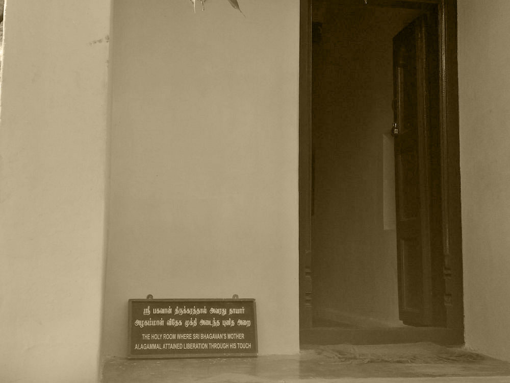 મોટી મોટી શીલાઓ પાસેના જાપલી જેવા દરવાજાથી અંદર ગયા પછી જોયું તો બીજા કેટલાક પ્રવાસીઓ અને શ્રી રમણ ભગવાનના અનુયાયીઓ પણ હતાં અને બધા સાદી પલોઠી કે પદ્માસનમાં ધ્યાનમગ્ન મુદ્રામાં બેઠા હતા.