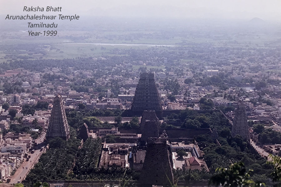 ધીમે-ધીમે સૂર્ય કિરણો પર્વતને પ્રકાશિત કરી રહ્યાં હતાં અને ખડકો આસપાસ ઝાડી-ઝાંખરાઓમાં ક્યાંક ક્યાંક નાના-નાના પંખીડાઓની ઉડાઉડ પણ દેખાતી હતી.આટલા refreshing વાતાવરણમાં હું અને સુભાષ પણ મૌન યાત્રા માફક પ્રાચીન અરુણાચલ પર્વતનો Mysterious mood અંદર ઉતારતાં ઉતારતાં સ્કંદાશ્રમ તરફ ડગ માંડતા હતા અને એવી ક્ષણોમાં એક એવો view point આવ્યો જ્યાંથી અમને નીચે તળેટીમાં રહેલા અરુણાચલેશ્વર મંદિરનો bird eye view મળતો હતો, આથી હું અને સુભાષ થોડીવાર ત્યાં ઉભા રહ્યાં અને મેં તિરુવન્નામલાઈ સ્થિત આ પ્રાચીન અરુણાચલેશ્વર મંદિરને તેના ગોપુરમ સાથે જીલ્યું અને પછી ધીમે ધીમે સ્કંદાશ્રમ પહોંચ્યા.