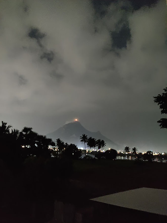 આ અગ્નિ કે અગ્નિ દીપમ, ૨,૬૭૧ ફૂટ નીચે રહેલી તળેટી સુધી અને આખા તિરુવન્નામલાઈ ગામમાંથી દેખાય છે અને તે સમયે શ્રી રમણાશ્રમમાં પણ અસંખ્ય ભક્તો દ્વારા ‘અરુણાચલ શિવ’નો મંત્રોચ્ચાર થાય છે જેનો સમૂહ ધ્વનિ ખાસ્સો meditative અને energetic હોય છે અને સમગ્ર દ્રશ્ય પણ મંત્રમુગ્ધ કરે તેવું enchanting હોય છે.