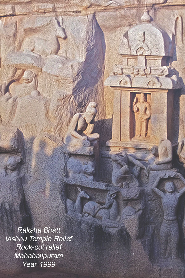 સિધ્ધો, ગણો, ગંધર્વો વિદ્યાધરો અને યક્ષોથી સભર ડાબી બાજુના વિશાળકાય ખડક પર કોઈ પુરાણ કથા મળી જશે એવા લોભે કેમેરો ફેરવતા મને એક વિષ્ણુ મંદિર જડી આવ્યું જેની આસપાસ પ્રાણીઓ, તપસ્વીઓ અને દિવ્ય-અલૌકિક, આકાશી તત્વો તો આલેખાયેલા જોવા મળ્યા જ પરંતુ ઈંદિરા ગાંધીના શાસન વખતની દસ રૂપિયાની નોટમાં છપાયેલા બે હરણો પણ Bas-reliefના દળદાર શિલ્પોમાં કંડારાયેલા જોવા મળ્યા જે શ્રીમતી ઈંદિરા ગાંધીની મહાબલિપુરમની મુલાકાત પછી દસની નોટમાં છપાયા હતા.