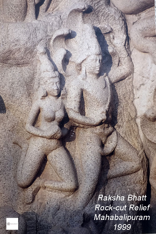Anyways, મહાબલીપુરમના અવર-જવરના રસ્તાની ધારે રહેલા આ વિશાળ rock-cut reliefના ડાબા ખડક પરના પૌરાણિક પાત્રો, કથાઓ હરણ-હંસલા, સિંહ-વાનર, શિવ-અર્જુન અને ભગીરથ રાજાને જોઈ-જીલીને જમણા ખડક પરના આકાશમાં ઉડતા હોય તેવા celestial bodiesના અલૌકિક figuresને પણ જીલ્યા ત્યારે બે ખડક વચ્ચેની ફાંટ કે તિરાડમાં કંડારેલું [Snake princess] નાગ કન્યાનું દળદાર શિલ્પ જોયું અને ફરી એક વખત મહાભારતની કથાના પાના ખુલ્યા કે ભાઈ, આ નાગકન્યા કોણ હતાં અને કોની પત્ની હતાં.