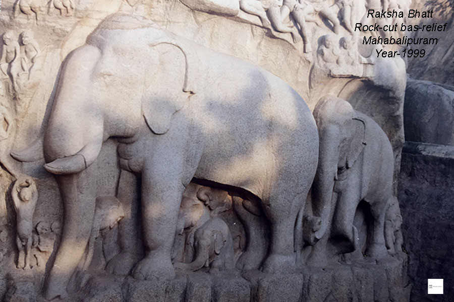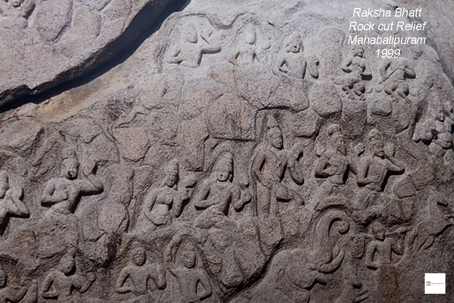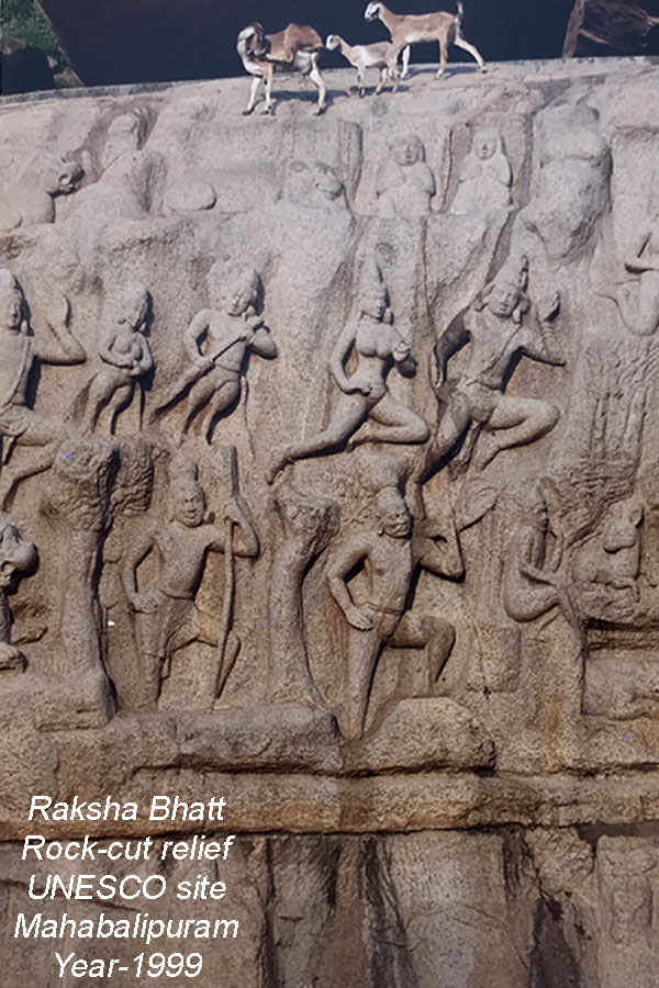 ૧૯૯૯ના કારતક મહિનાની સવારના તાજ્જા તડકે પંચરથ સ્મારકો કર્યા પછી ત્યાંથી અમે, મહાબલિપુરમમાં ઘૂઘવતા, બંગાળના ઉપસાગરના કોરોમંડળ સમુદ્રતટની હૂંફાળી હવાની લહેરખીઓ વચ્ચે વિશ્વના સૌથી વિશાળ, ૯૬x૪૩ ફૂટના, open-air rock cut reliefને જોવા ગયા. આ rock-cut relief કુલ બે મહાકાય ખડકો કે શીલાઓ પર રાજા ભગીરથે ગંગા અવતરણ [Descent of the Ganga] માટે કરેલું તપ કે ધનુર્ધર અર્જુને આદિદેવ શિવ પાસેથી પાશુપતાશ્ત્ર પ્રાપ્ત કરવા કરેલા તપની [Arjun’s Penance] પૌરાણિક કથા અને તેના પાત્રોનું નિરૂપણ લઈને છેલ્લા ૧૨૦૦ વર્ષોથી લાખો-કરોડો પ્રવાસીઓને અને નિષ્ણાંત અભ્યાસુઓને આકર્ષતું ઉભું હતું.