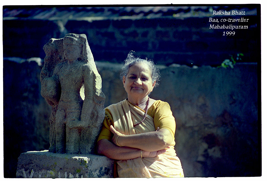 Pink graniteની UNESCO વિશ્વ ધરોહરની યાદીમાં રહેલી આ સંરચનાઓમાં વરાહ ગુફામંદિરના વરાહ-આદિવરાહ, ગજલક્ષ્મી અને દળદાર High Bas Relief જે દીવાલો પર કંડારેલા હતાં તે શિલ્પો અને ગુફા મંદિરની સ્થાપત્ય શૈલીમાં જાણકારોએ Greco-Roman એટલે પ્રાચીન ગ્રીક અને રોમન સ્થાપત્ય શૈલીની અસરો જોઈ-પારખીને આપણા ભારતના આ ગુફા મંદિરોને વિશ્વના શ્રેષ્ઠમાંના એક એવા cave temples ગણ્યા છે તેનું ગૌરવ લેતી હું ભારતના રાષ્ટ્ર ધ્વજને ભરું તેવી અગણિત સલામો ભરતી બા અને સુભાષ સાથે બપોરના ભોજન અર્થે મહાબલિપુરમના બસ સ્ટેન્ડ પાસે આવેલા મમલા ભવન વેજ રેસ્ટોરેન્ટમાં જઈ ટામેટા-મરી નાખેલી જીંજર રસમ સાથે નાળીયેરની ચટણી, સાંભાર-ભાત, પપ્પડમ, એકાદ સબજી અને સ્વીટ ડિશમાં રોસ્ટેડ કાજુ નાખેલી મગની દાળમાંથી બનાવેલી ક્રિમી પાયસમ જમીને ગેસ્ટ હાઉસ પર જઈ એકાદ કલાકની ઊંઘ ખેંચી બપોર પછી મહાબલિપુરમની કુલ ચાલીસ Ancient Monumental sitesમાંથી સાંજે પાંચ સુધી ખુલ્લા રહેતા Sculpture museum પહોંચી જૂના colonial buildingમાં રહેલા આ historical heritage museumમાં અમે પલ્લવ, ચૌલા અને વિજયનગર વંશના શિલ્પો જોયા અને ઘટાદાર વૃક્ષો વાળા અવાવરું અને વનવગડા જેવા લાગતાં પરિસરની પથ્થરની ઓટલીઓ અને પિઠીકાઓ પર મુકેલા કેટલાક ખંડિત શિલ્પો સાથે મેં બા અને સુભાષના ફોટા પાડ્યા. એ વખતે કારતકની સાંજના કિરણો, પલ્લવ વંશના કોઈ શિલ્પ સાથે compose કરેલા, બાના portraitને anti-lightની ગમતી glareમાં ચમકતાં હતાં અને 1999માં બાસઠ વર્ષની થયેલી બા તેની confident અદામાં મરક-મરક થતી ફોટો પડાવતી હતી.
